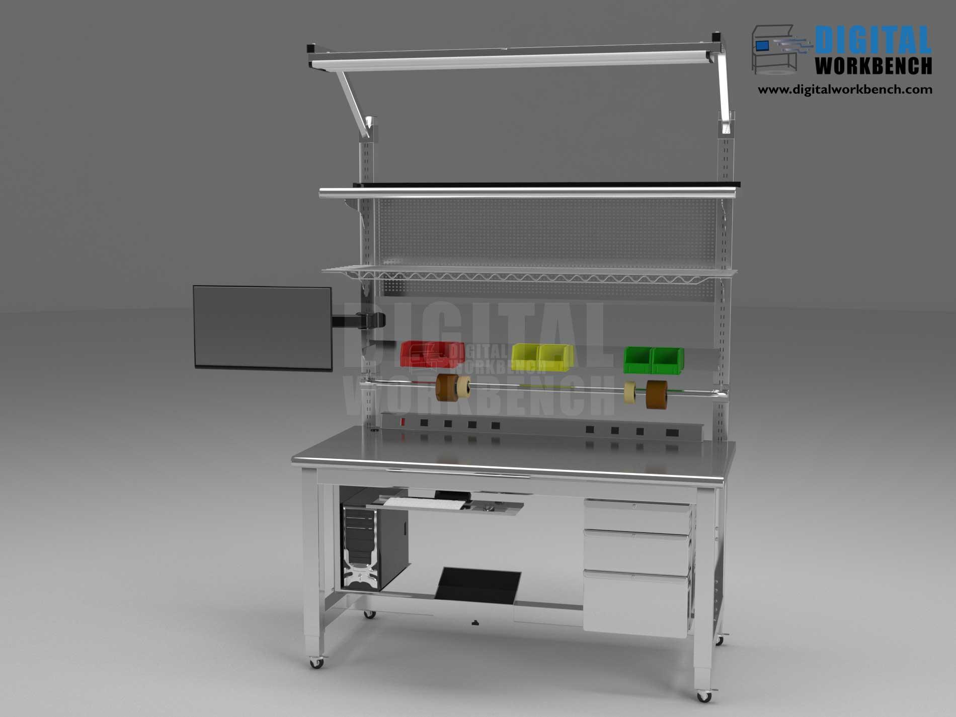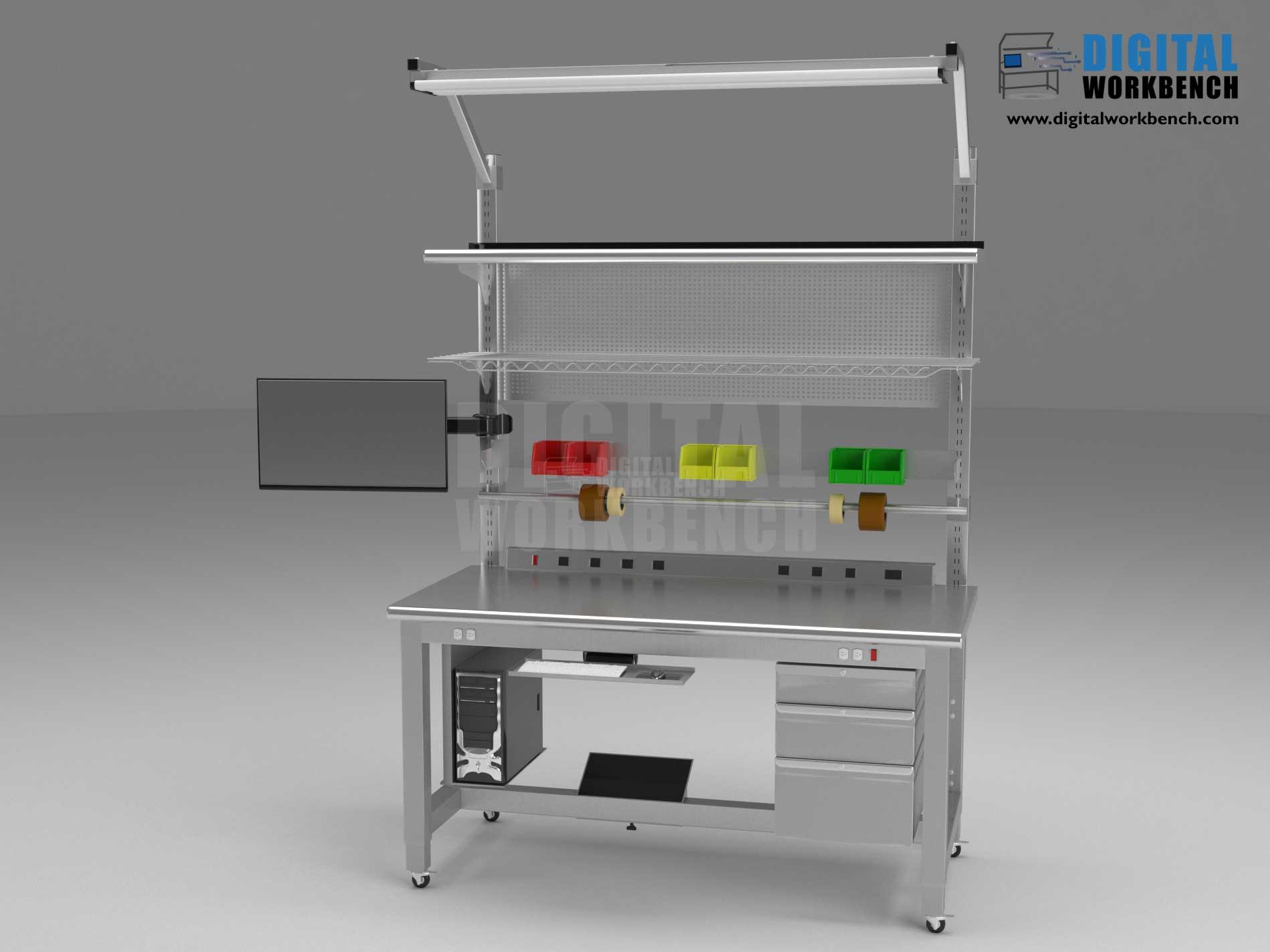At Digital Workbench, we create lab-ready designs that seamlessly integrate technology. Easily set up your monitor, computer, and keyboard with ergonomic mounts. Then, organize your workstation with plugins, stacked drawers, shelves, bin boxes, and more. This stainless-steel worktop is clean, clear, and well-lit by the overhead LED light bar.